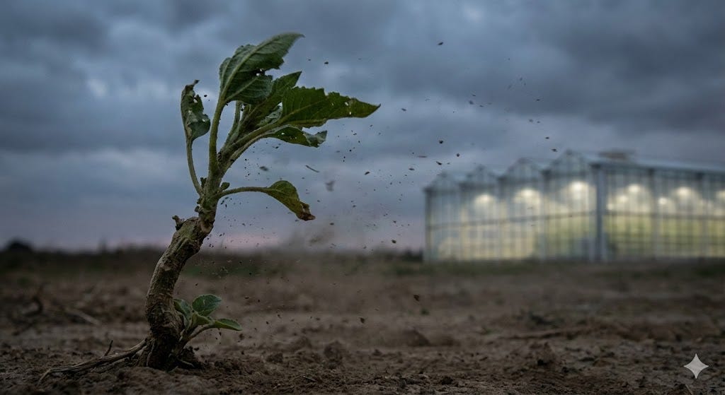 A gardener knows something that most futurists do not: a seedling raised entirely indoors will die the moment it meets the open sky. Not because the world is cruel, but because the plant was never hardened. In horticulture, hardening is the deliberate, graduated exposure of a young plant to wind, temperature swings, and direct sunlight. The wind, in particular, does something remarkable. It stresses the stem just enough to trigger genetic changes that produce structural proteins, thickening and strengthening the tissue from the inside out. Without that periodic stress, the stem remains brittle. It looks alive, but it has never truly prepared itself to stand on its own.